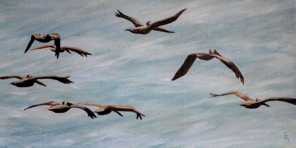 “Pelicans” Oil on Canvas, 9″x 16″, 2023 (Private Comission)