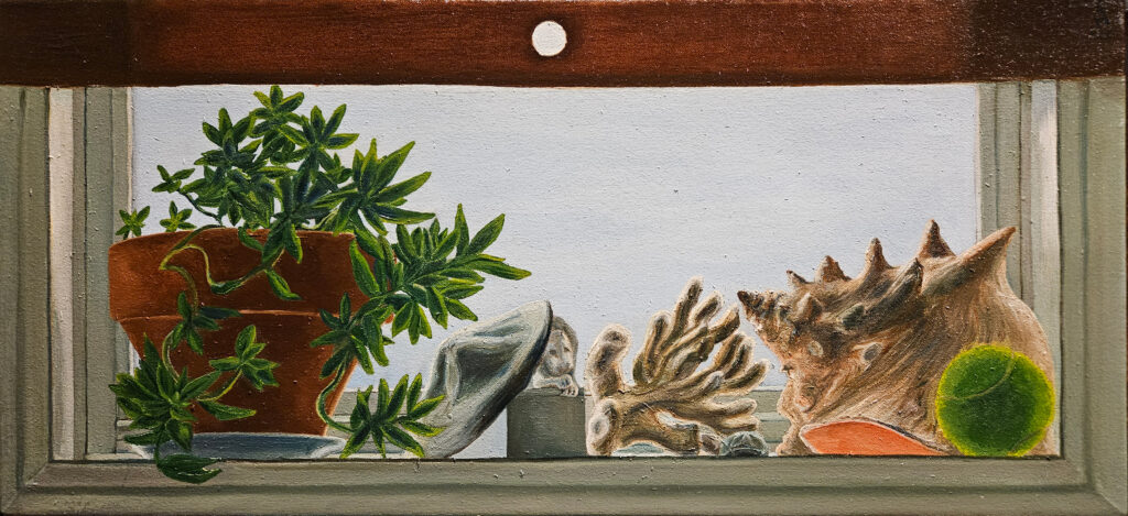“Windowsill Still Life” 10″x22″, Oil on Canvas, 2024. (Private Comission)